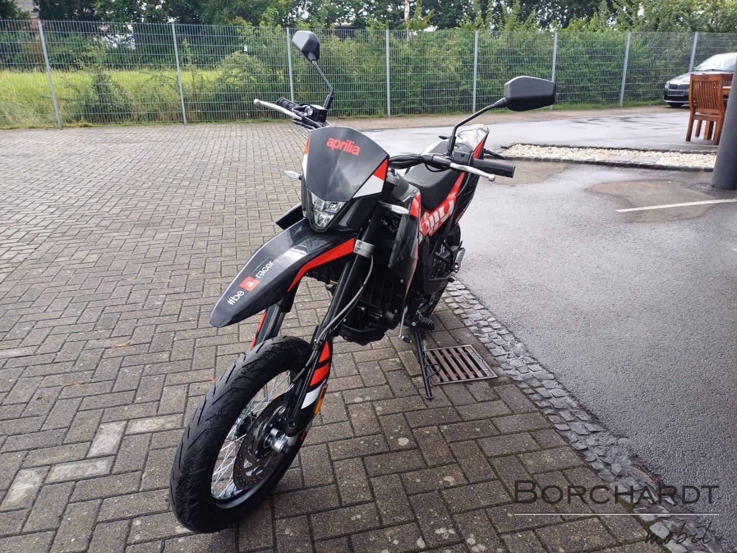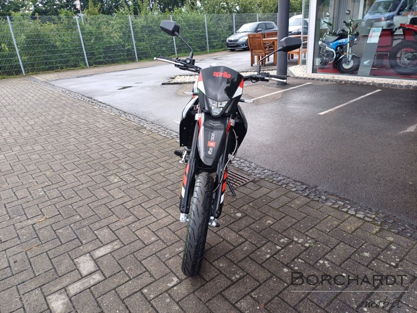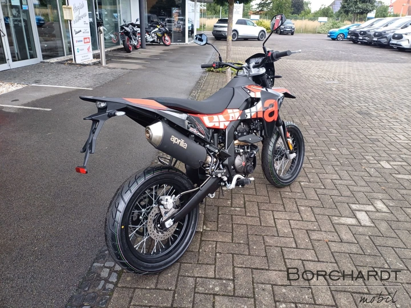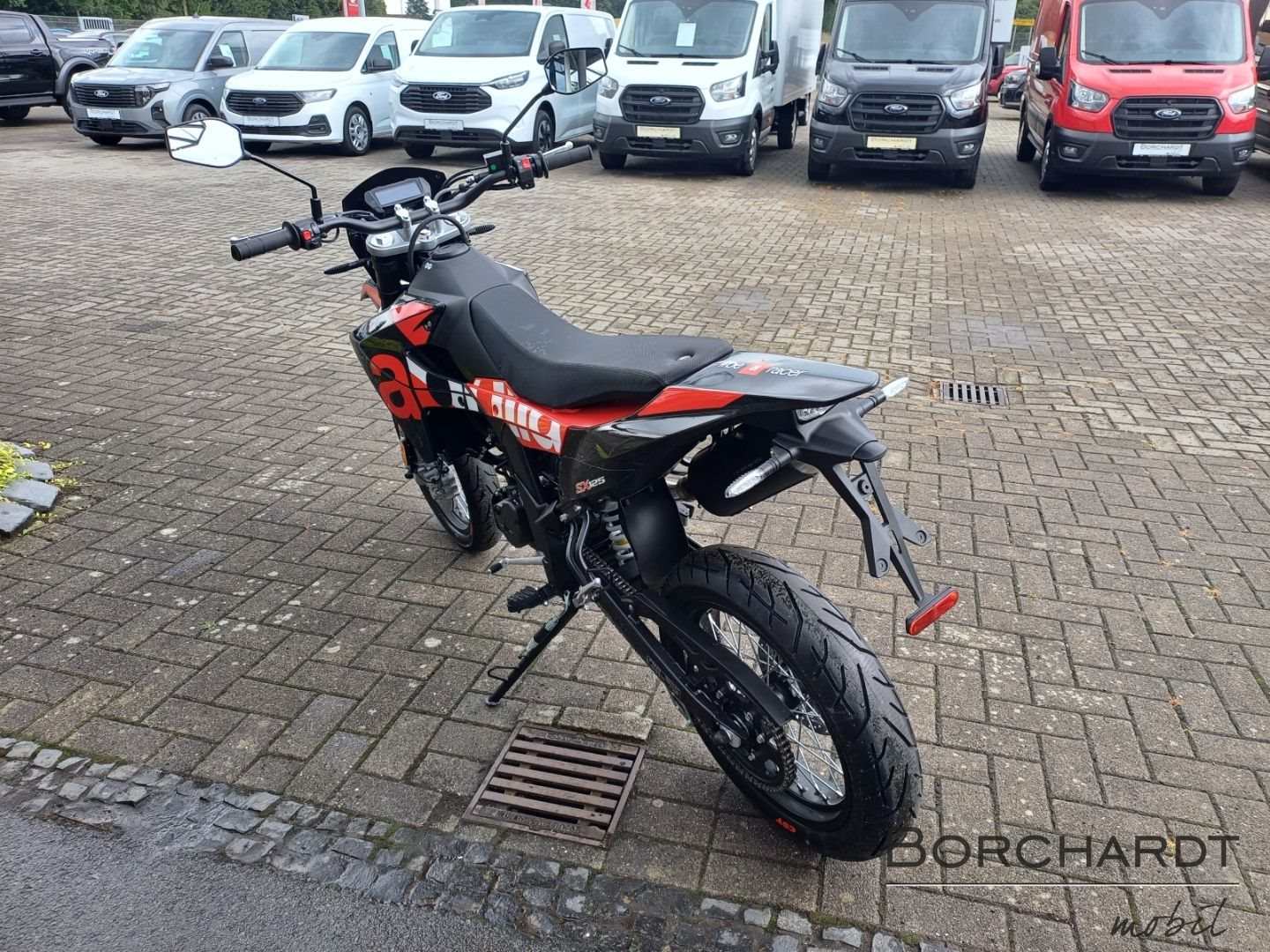 Die Aprilia SX 125 bleibt nie unbemerkt. Ihre Karosserie ist von den neuesten Trends im Bereich der Motard-Motorräder inspiriert und verleiht ihr ein dynamisches und modernes Aussehen. Eine auffällige, glänzende schwarze Lackierung umgibt Lenker, Motor, Schwinge und den gesamten Rahmen und steht im Kontrast zur mattschwarzen Auspuffabdeckung. Die 17 Zoll Speichenräder sind mit sportlichen Straßenreifen ausgestattet.