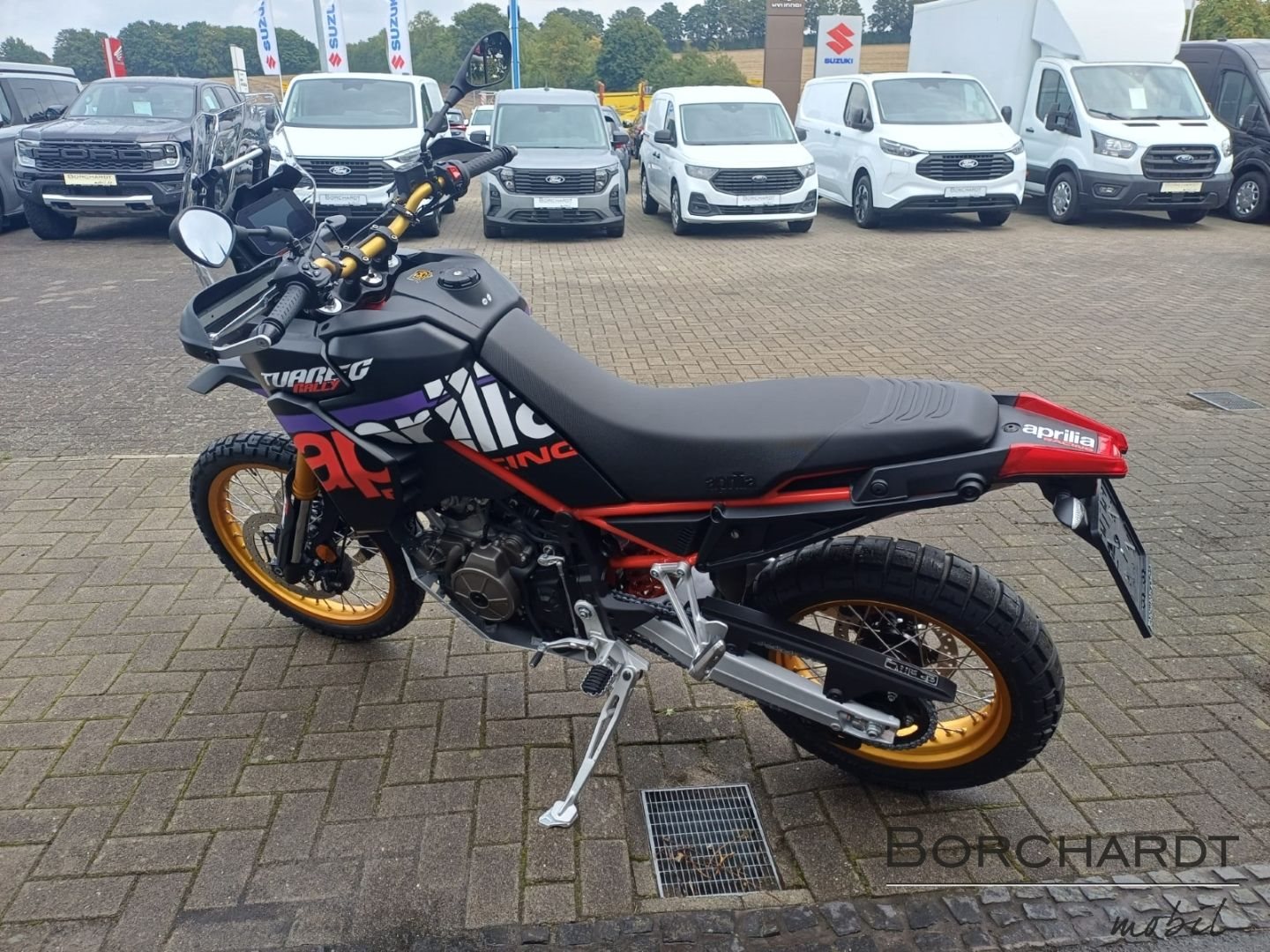 Rally replicaDie Aprilia Tuareg Rally ist in demselben unverwechselbaren Rally Race Replica-Look erhältlich, der auch das Motorrad von Jacopo Cerutti geziert hat, als er im Januar 2024 die legendäre Dakar-Ziellinie als Erster überquerte. Die Gabel, die Felgen und der Lenker sind in sportlichem Gold eloxiert. Die Kettenführung, der extrem robuste Motorschutz aus Aluminium, die verstärkten Handprotektoren und der neue hohe vordere Fender unterstreichen den kompromisslosen Offroad-Charakter dieses Motorrads. Der höhere Sitz und der erhöhte Lenker bieten auf besonders extremen Strecken eine bessere Kontrolle beim Fahren im Stehen.