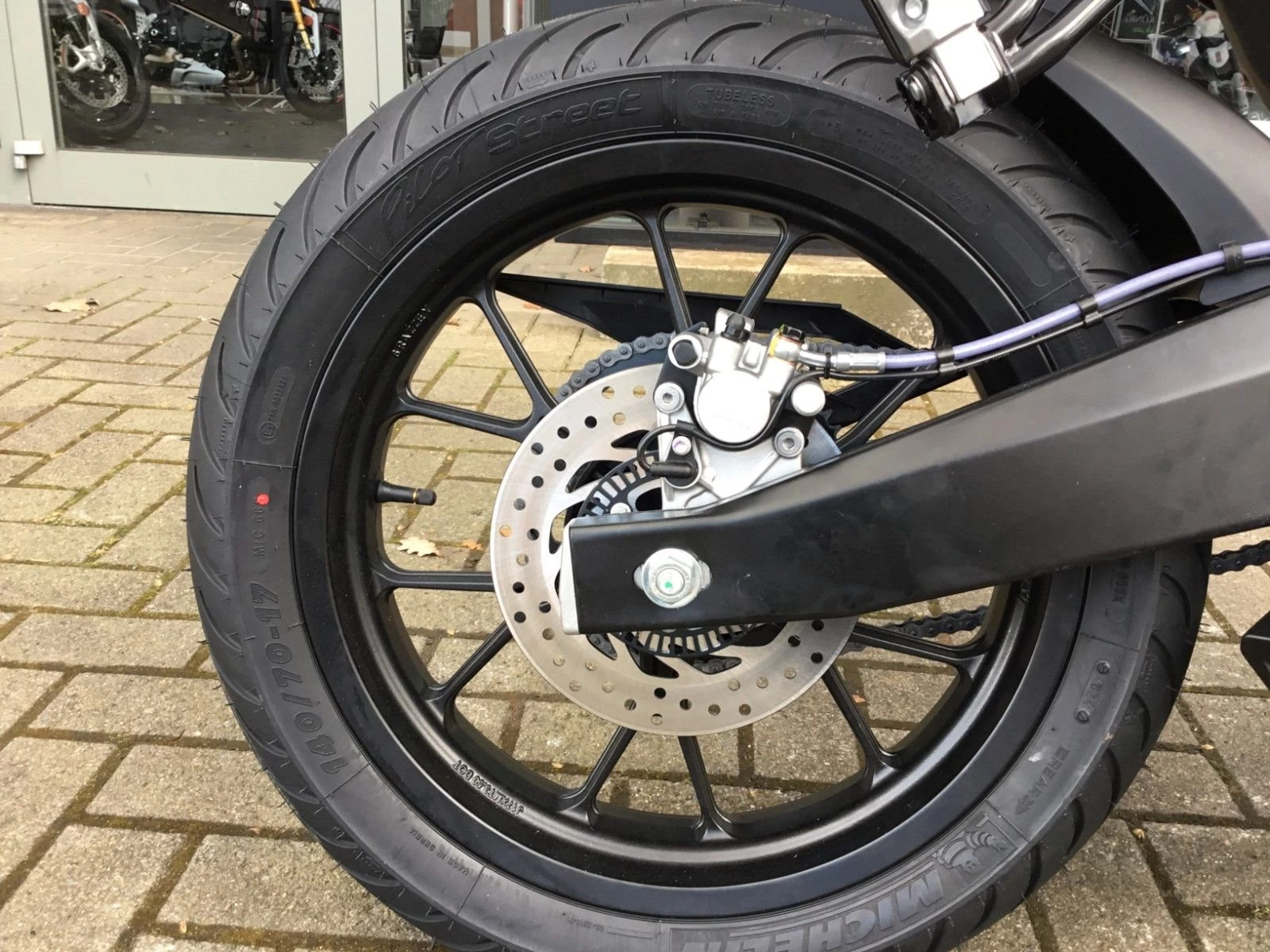 - 125 cm3 Euro 5+ Motor Der Motor der Aprilia Tuono 125 ist ein moderner Einzylinder mit Vierventilsteuerung und Flüssigkeitskühlung, Euro-5+-konform. Mit 15 PS (11 kW) Maximalleistung bei 10.500 U/min und 11,4 Nm Drehmoment bei 8.500 U/min bietet er Top-Leistungen in der 125er-Klasse.