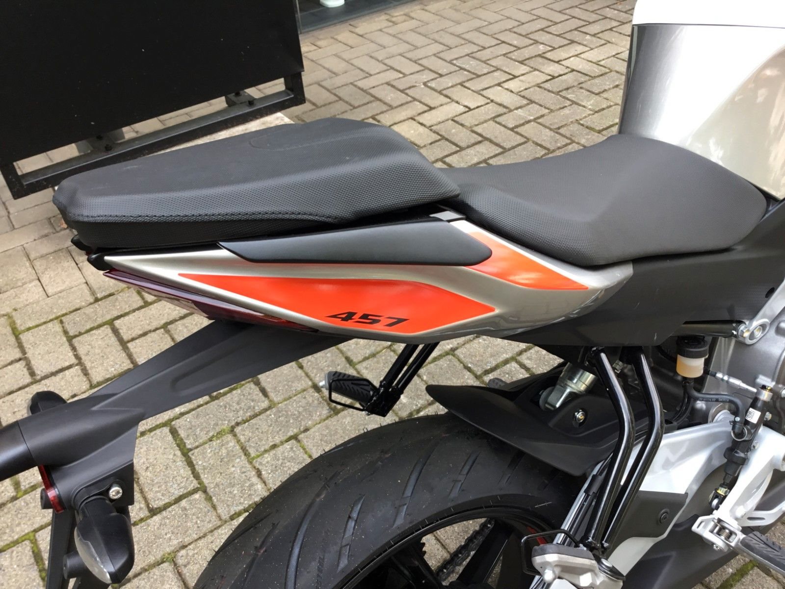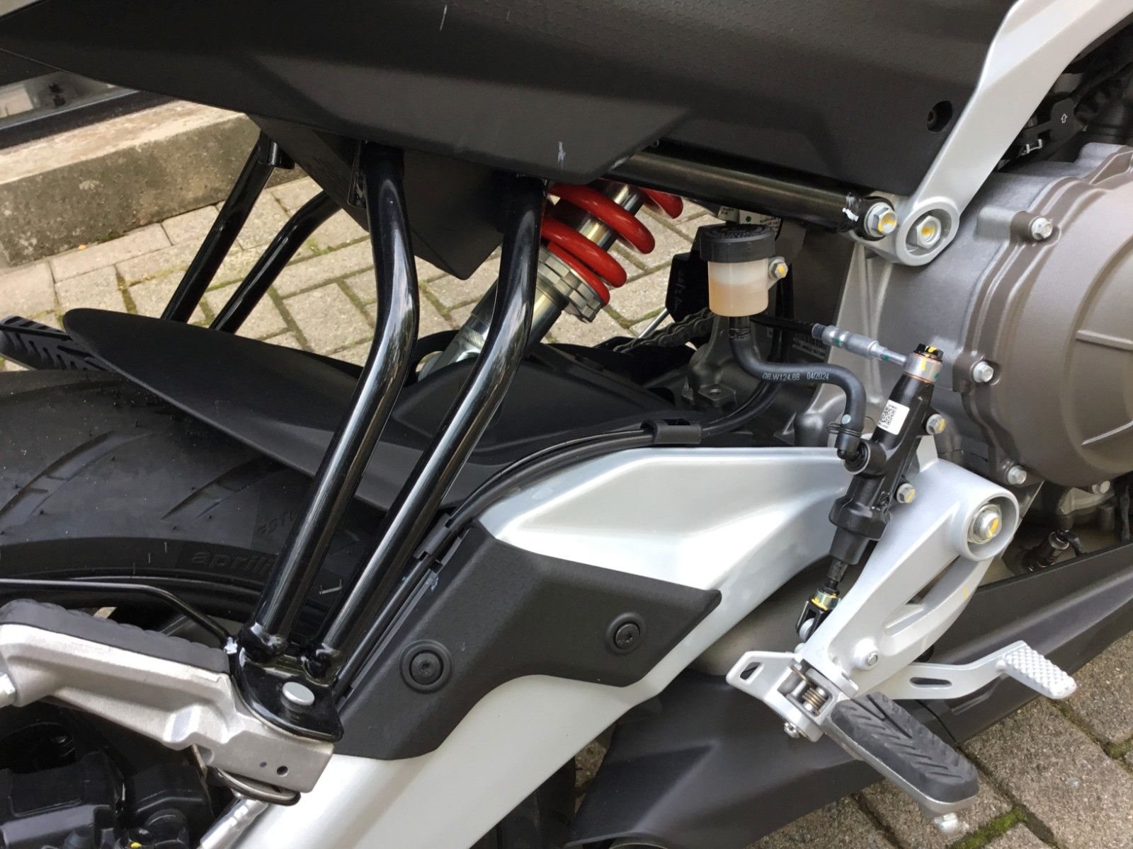 - Absolute Leichtigkeit und Agilität Die Aprilia Tuono 457 ist die einzige in ihrem Segment mit einem Aluminiumrahmen - eine unverzichtbare Wahl für exzellentes Fahrverhalten. Entwickelt mit modernsten CAE-Technologien (Computer Aided Engineering) und intensiven Straßentests trägt er zu einem Trockengewicht von nur 159 kg bei - für ein rekordverdächtiges Leistungsgewicht. Das Fahrwerk ist auf hohem Niveau: Die 41 mm Upside-Down-Gabel ist im Federweg verstellbar, ebenso wie das hintere Federbein, das auf der asymmetrischen Stahlschwinge arbeitet. Das perfekte Rezept für ein straffes, aber extrem reaktionsfreudiges Fahrerlebnis.