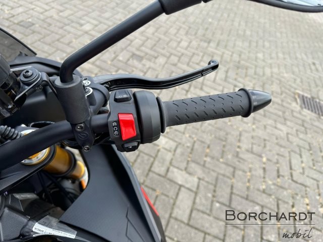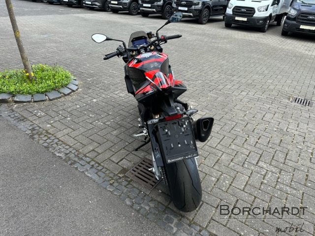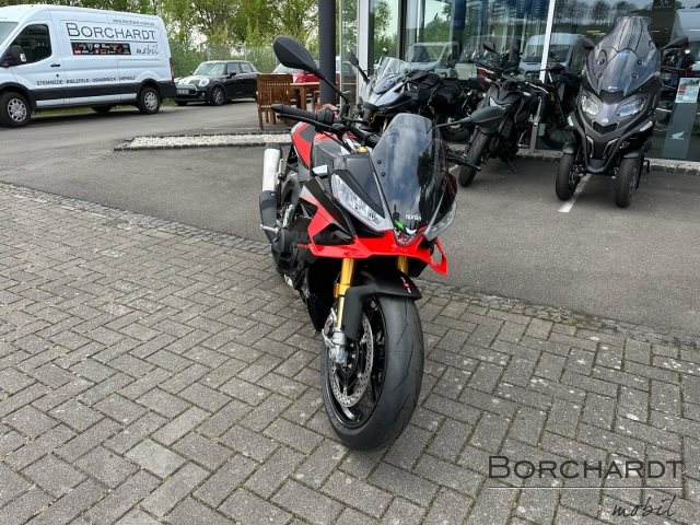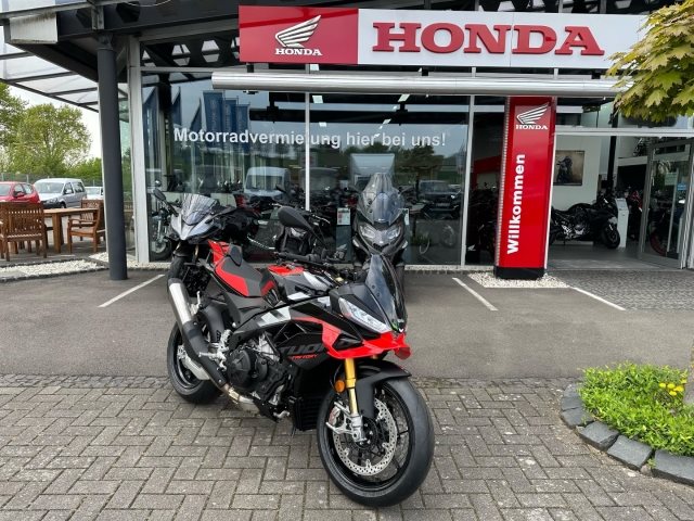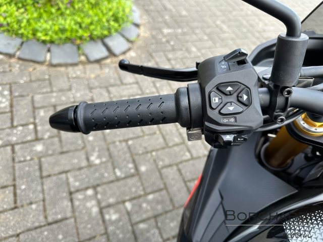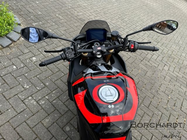 - Änderungen, Zwischenverkauf und Irrtümer vorbehalten., Die Aprilia Tuono V4 ist das unverwechselbare Hyper-Naked-Bike, eine Maschine, die Rennsport-Performance in pure Adrenalinausschüttung verwandelt. Sie zeigt sich frech auf der Straße und unschlagbar auf der Rennstrecke. Mit ihrem aggressiven Design, dem 180 PS starken V4-Motor mit E5+, aerodynamischen Winglets für verbesserte Stabilität und einem a-PRC-Elektronikpaket mit prädiktiver Logik passt sie sich deinem Fahrstil an und bietet ein kompromissloses Fahrerlebnis.