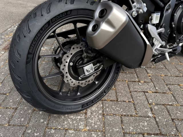 Sicher unterwegs im Stadtverkehr. Mit der natürlichen aufrechten Sitzposition hast du alles im Blick. Leichte 5-Speichen-Räder, eine sportliche Schwinge und Fußrasten aus Aluminium sparen Gewicht. So lässt sich die Maschine dynamisch und mühelos lenken. Die 296-mm-Doppelschreibenbremse mit radial montierten Zweikolben-Bremszangen von Nissin sorgen für eine herausragende Bremsleistung. Mit der abgestimmten SFF-BP-Gabel (Separate Function Fork - Big Piston) von Showa (41 mm) bekommst du das Feedback und den Grip, um hart in die Kurven zu gehen. Unübertroffen.