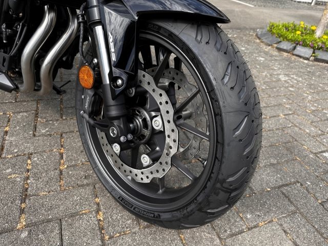 Sicher unterwegs im Stadtverkehr. Mit der natürlichen aufrechten Sitzposition hast du alles im Blick. Leichte 5-Speichen-Räder, eine sportliche Schwinge und Fußrasten aus Aluminium sparen Gewicht. So lässt sich die Maschine dynamisch und mühelos lenken. Die 296-mm-Doppelschreibenbremse mit radial montierten Zweikolben-Bremszangen von Nissin sorgen für eine herausragende Bremsleistung. Mit der abgestimmten SFF-BP-Gabel (Separate Function Fork - Big Piston) von Showa (41 mm) bekommst du das Feedback und den Grip, um hart in die Kurven zu gehen. Unübertroffen.