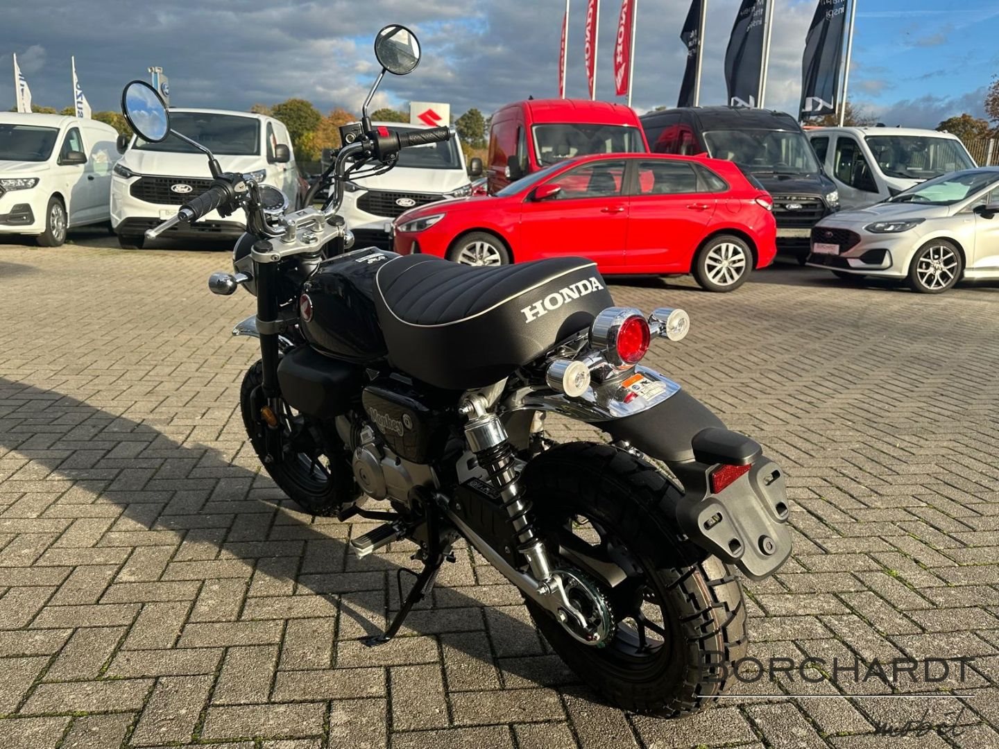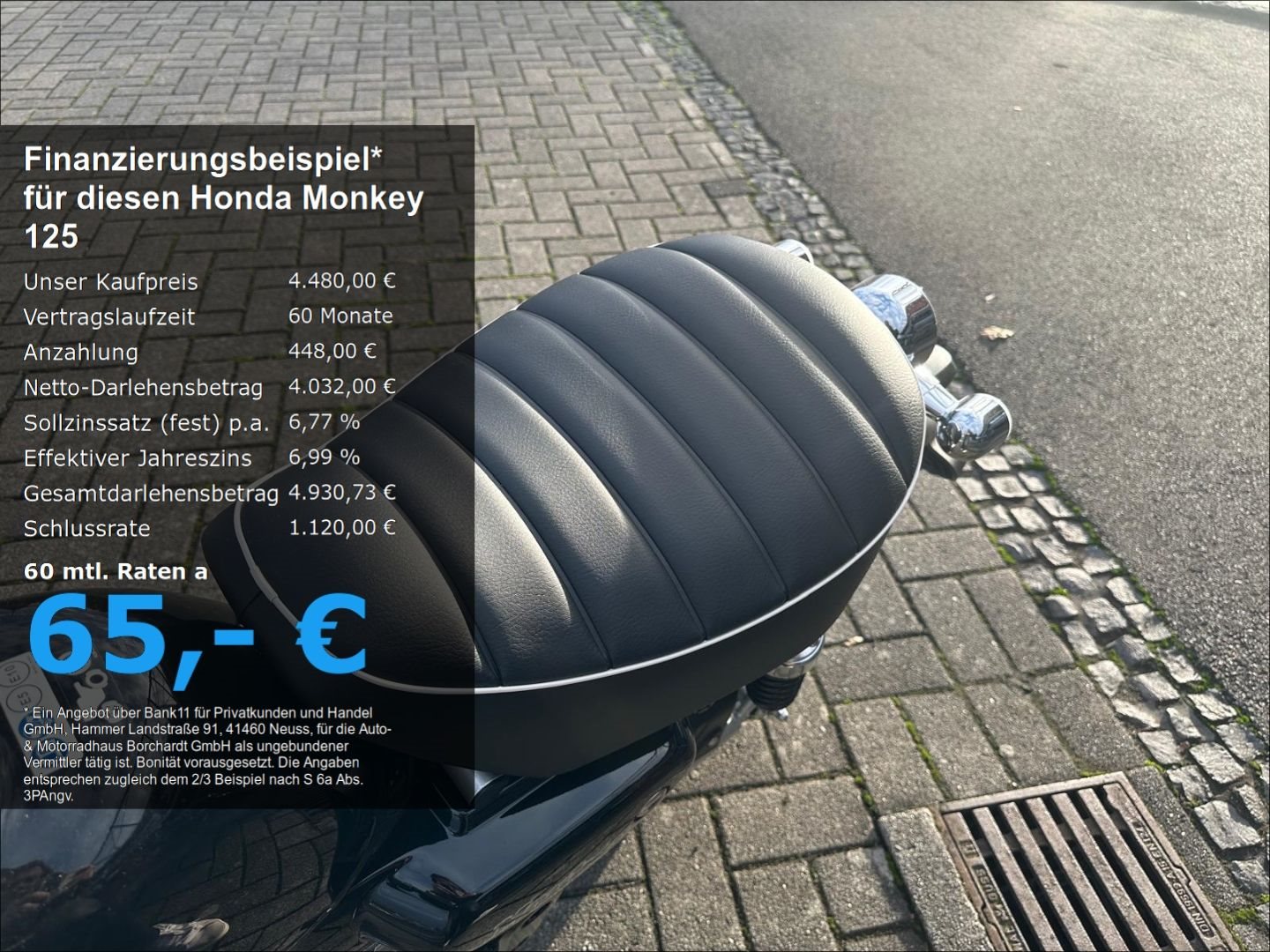 Die Monkey ist etwas ganz Besonderes. Sie hat ihren ganz eigenen Stil. Das macht ihren einzigartigen Charakter aus. Der verchromte Hochlenker sowie die einheitliche Lackierung von Rahmen, Schwinge und Stoßdämpfern sowie der Erdnusstank und die hoch angesetzten Radabdeckungen ziehen die Blicke auf sich. Weiter unten sind die wuchtigen Stollenreifen ein wahrer Blickfang. In das robuste Chassis sind neben dem sparsamen, luftgekühlten 125-cm-Motor auch ein 5-Gang-Getriebe und ein IMU-gesteuertes ABS eingebaut. Freue dich über ein kleines, 104 kg leichtes Motorrad mit einer bequemen Sitzhöhe von nur 775 mm. Ein kleines Motorrad mit großem Herz, das Spaß macht und viel zu bieten hat. Das ist die Monkey.