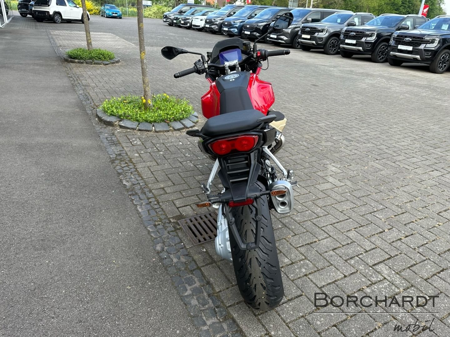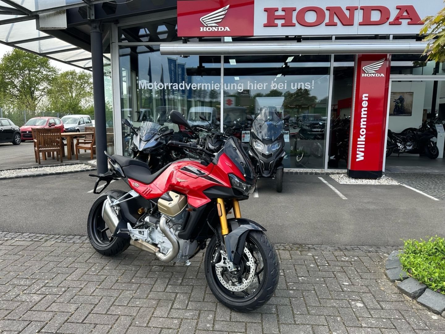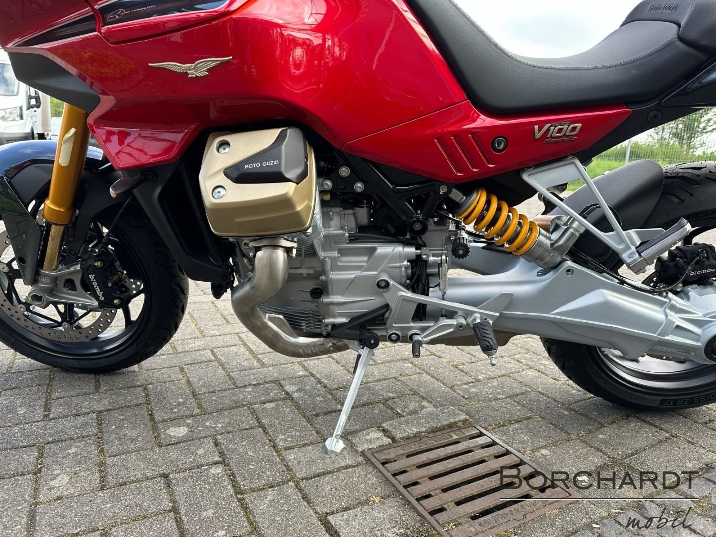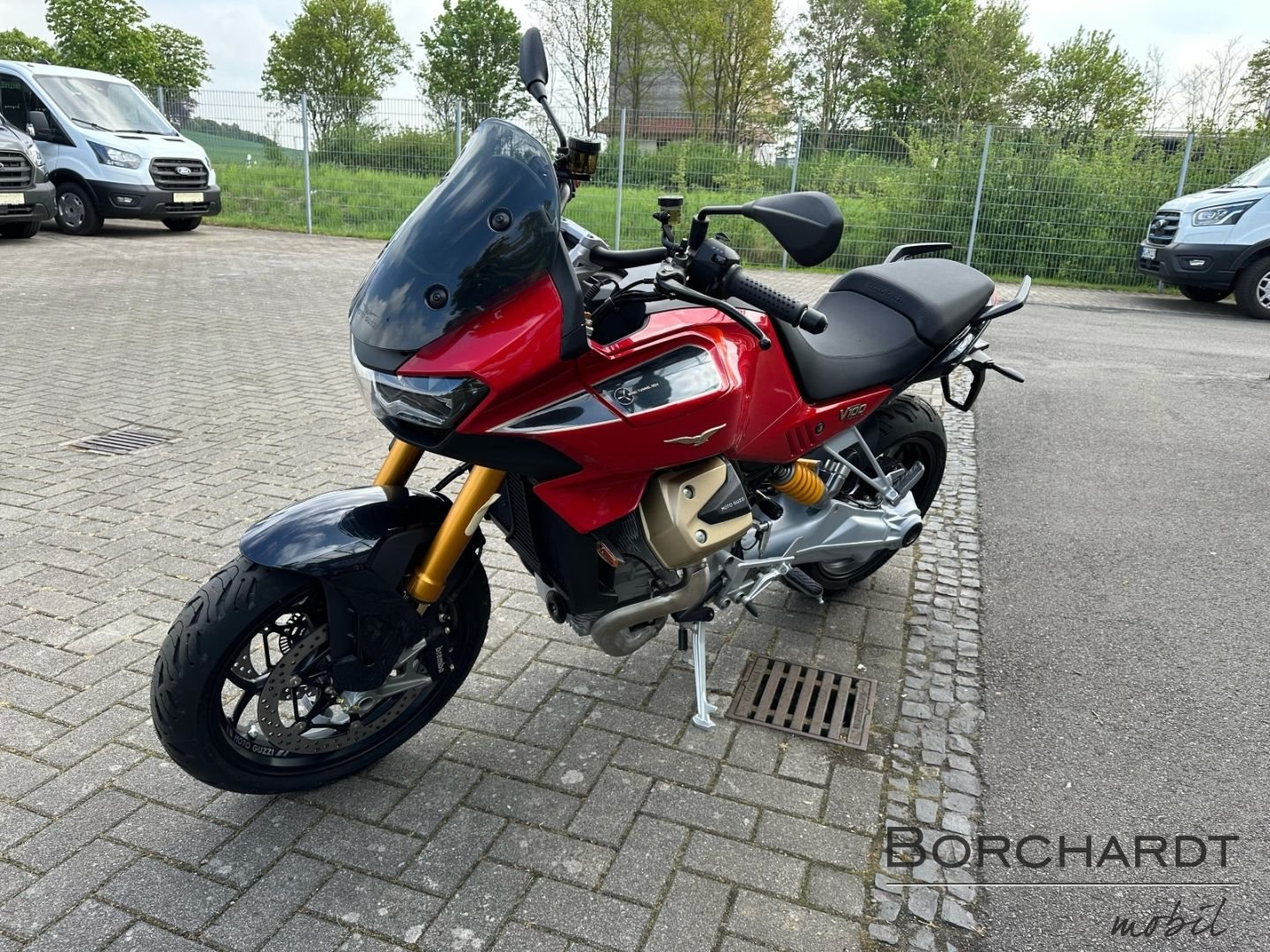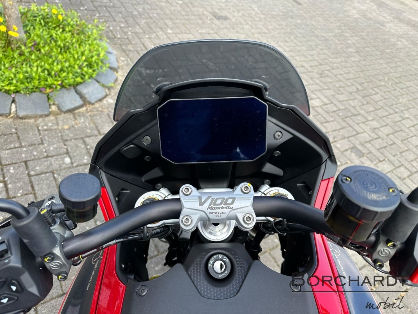 Der Zukunft entgegenInnovation und Komfort stehen im Vordergrund mit einem Technikpaket, das ein semiaktives Öhlins Smart EC 2.0 Fahrwerk, den bidirektionalen Quick Shifter, Inertiaplattform (IMU), Kurven-ABS, TPMS (Reifendruckkontrollsystem) und Heizgriffe umfasst. Mit der Moto Guzzi MIA Multimedia-Plattform kann das Smartphone über Bluetooth mit dem Bordsystem des Motorrads verbunden werden, sodass Anrufe, Nachrichten und die Wiedergabelisten ganz einfach verwaltet werden können.