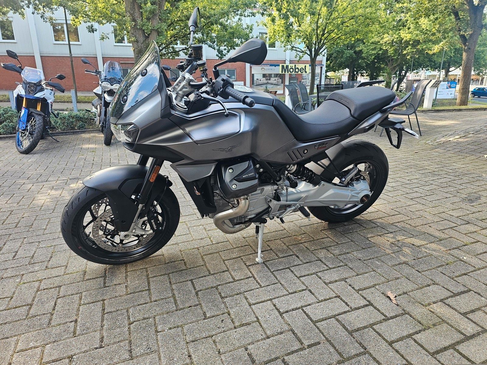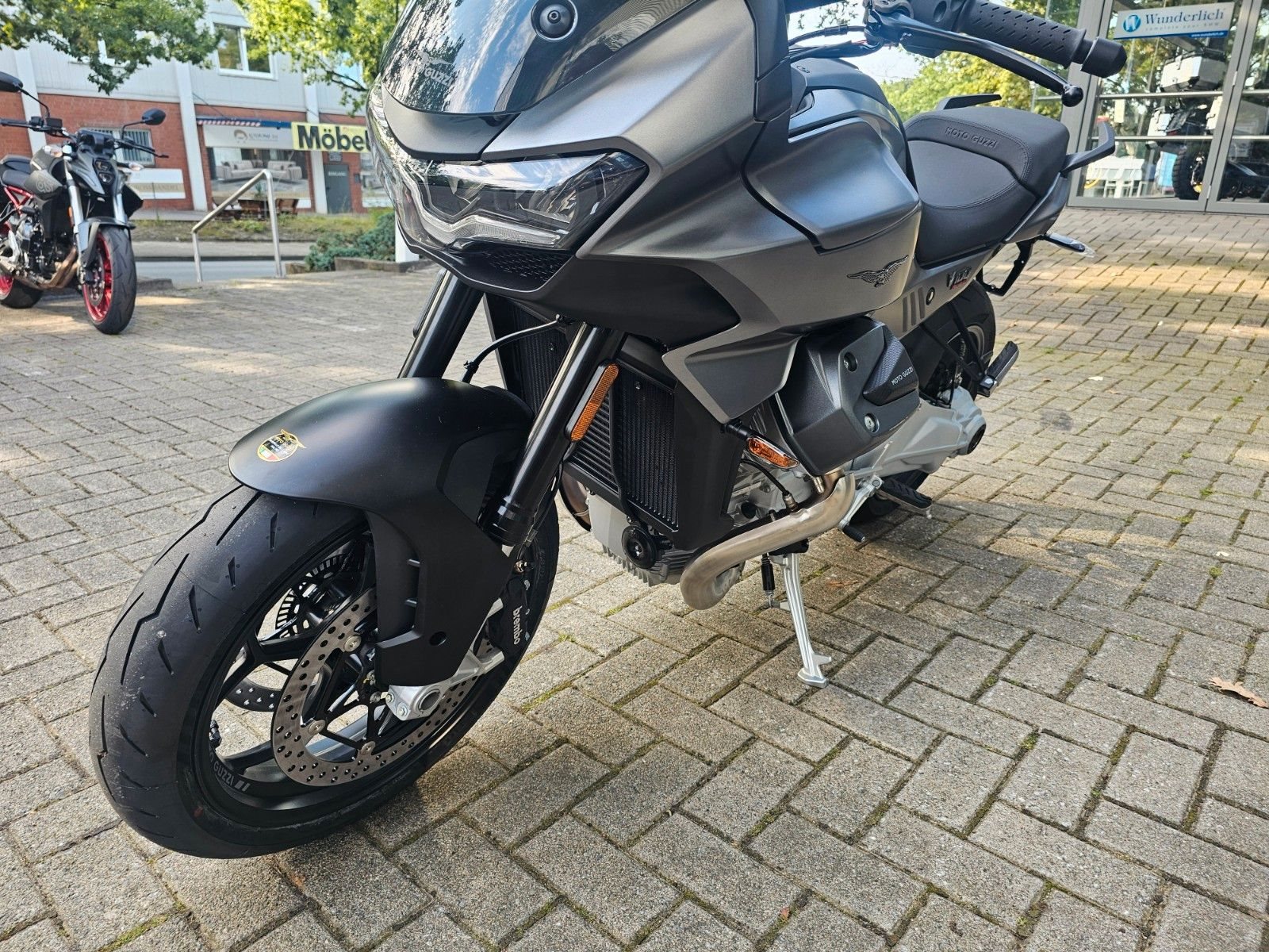 - Full-LED-Lichttechnik Zu den vielen serienmäßigen Details, die alles andere als Standard sind, gehört auch das Full-LED-Lichtpaket. Die Scheinwerfereinheit sorgt mit Kurvenlichtfunktion für mehr Sicherheit und beste Sichtbarkeit. Schön anzusehen spiegelt das LED-Tagfahrlicht unverwechselbar die Silhouette des Moto Guzzi Adlers wider.