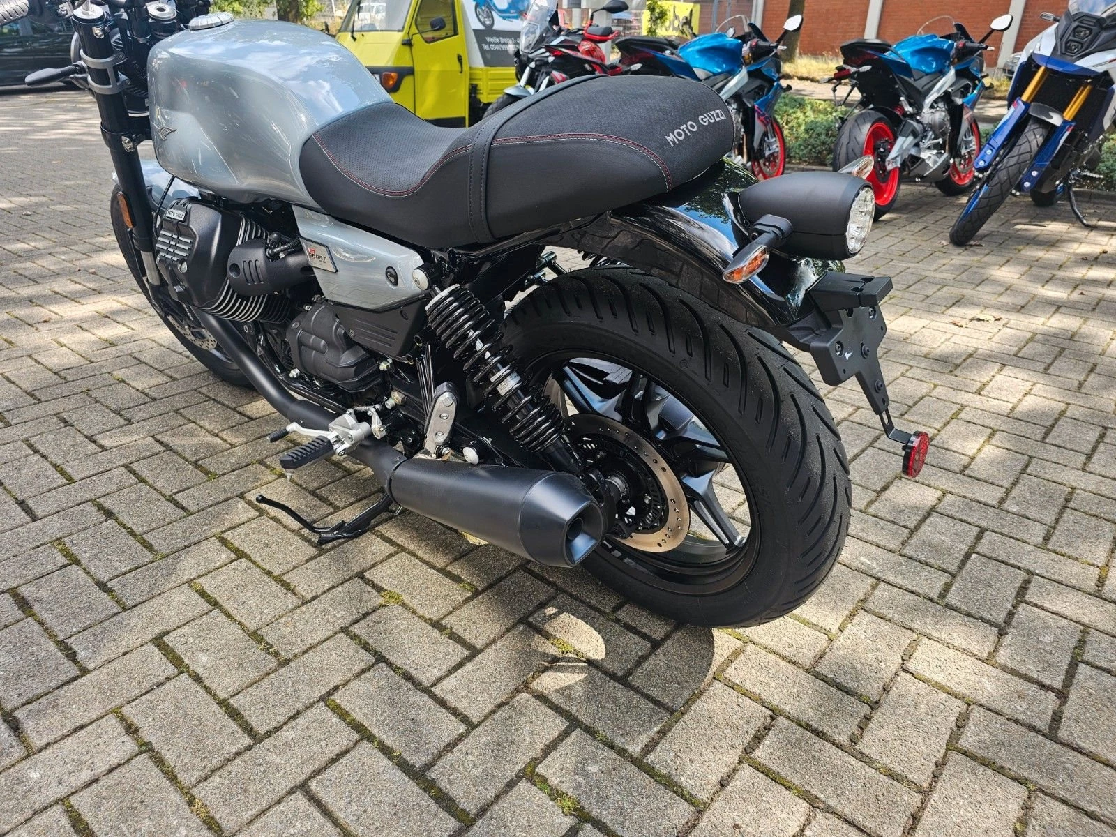 - Euro 5+ V-Twin Motor Der ikonische, luftgekühlte, längs eingebaute 90° V-Twin von Moto Guzzi erfüllt jetzt die Euro 5+ Norm. Mit einem Hubraum von 853 cm3 liefert er 67,3 PS bei 6.900 U/min und 79 Nm Drehmoment bei 4.400 U/min, für ein dynamisches und mitreißendes Fahrerlebnis, besonders bei niedrigen und mittleren Drehzahlen. Die vergrößerte Airbox, das neue Steuersystem und der optimierte Kolbenkühlkreislauf steigern Leistung und Effizienz.