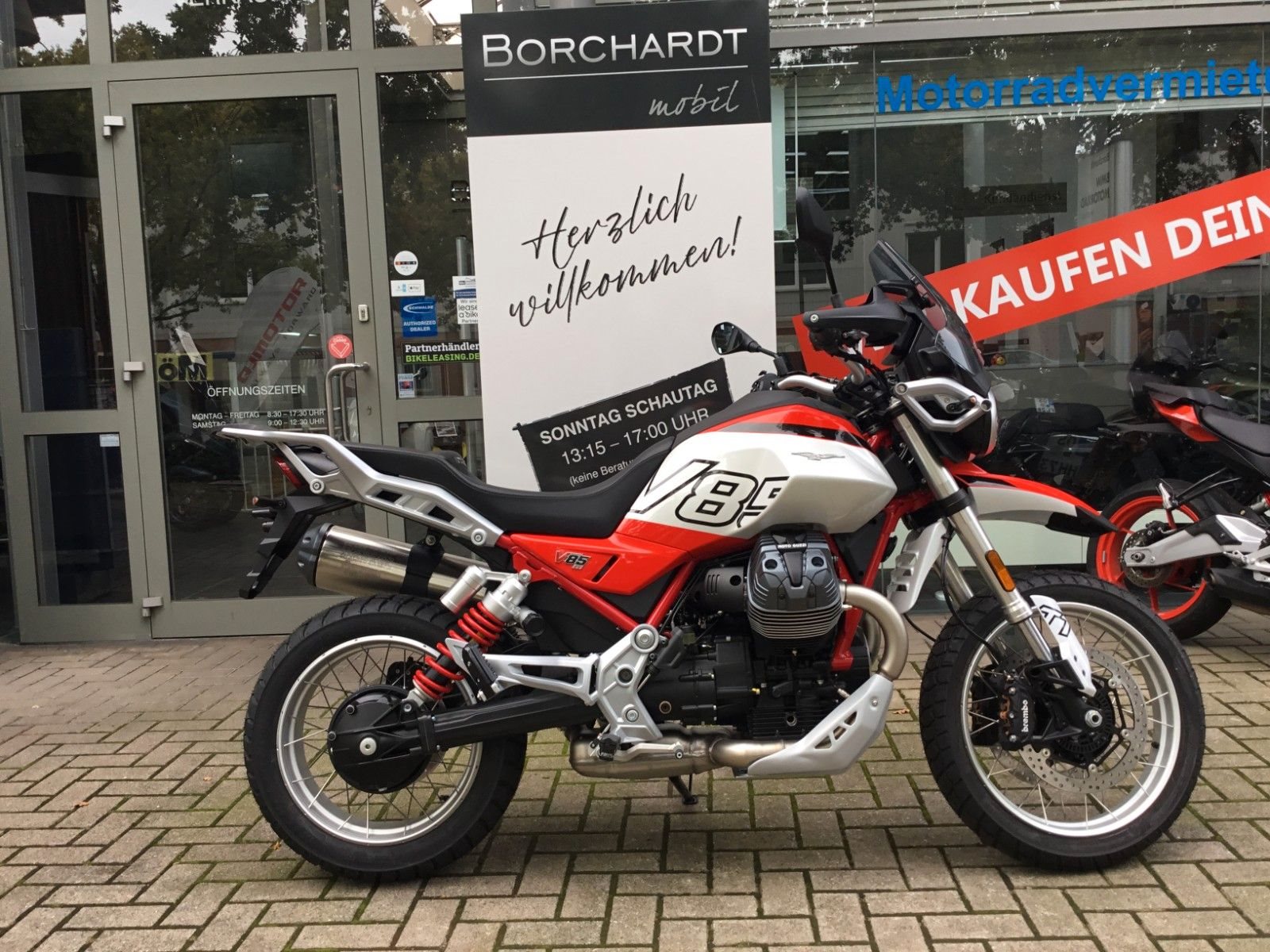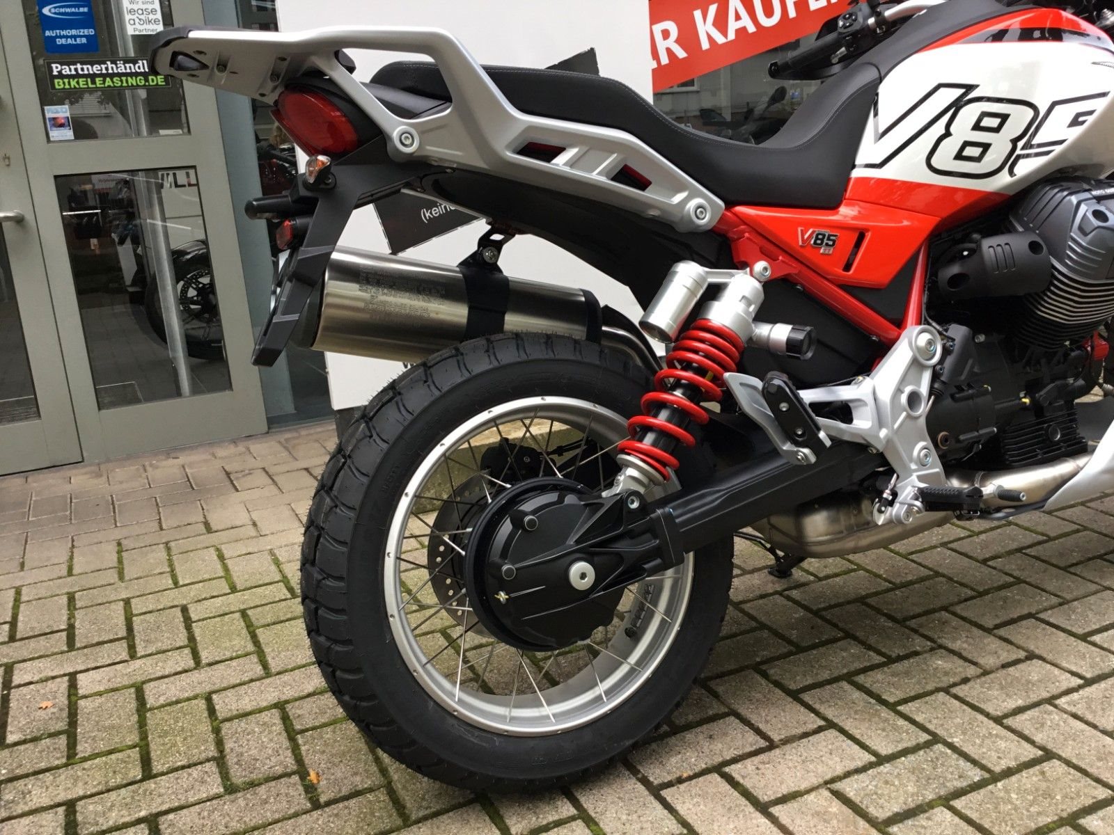 - Beeindruckender Look Die V85 TT ist auch in puncto Stil authentisch und ihr auffälliger Look wird Sie schon vor dem Aufsitzen begeistern. Die mutige Zweifarbigkeit und der rote Rahmen und Stoßdämpfer (mit einstellbarer Vorspannung) verbinden sich mit Offroad-Merkmalen wie der Ölwanne aus Aluminium und den Handprotektoren.