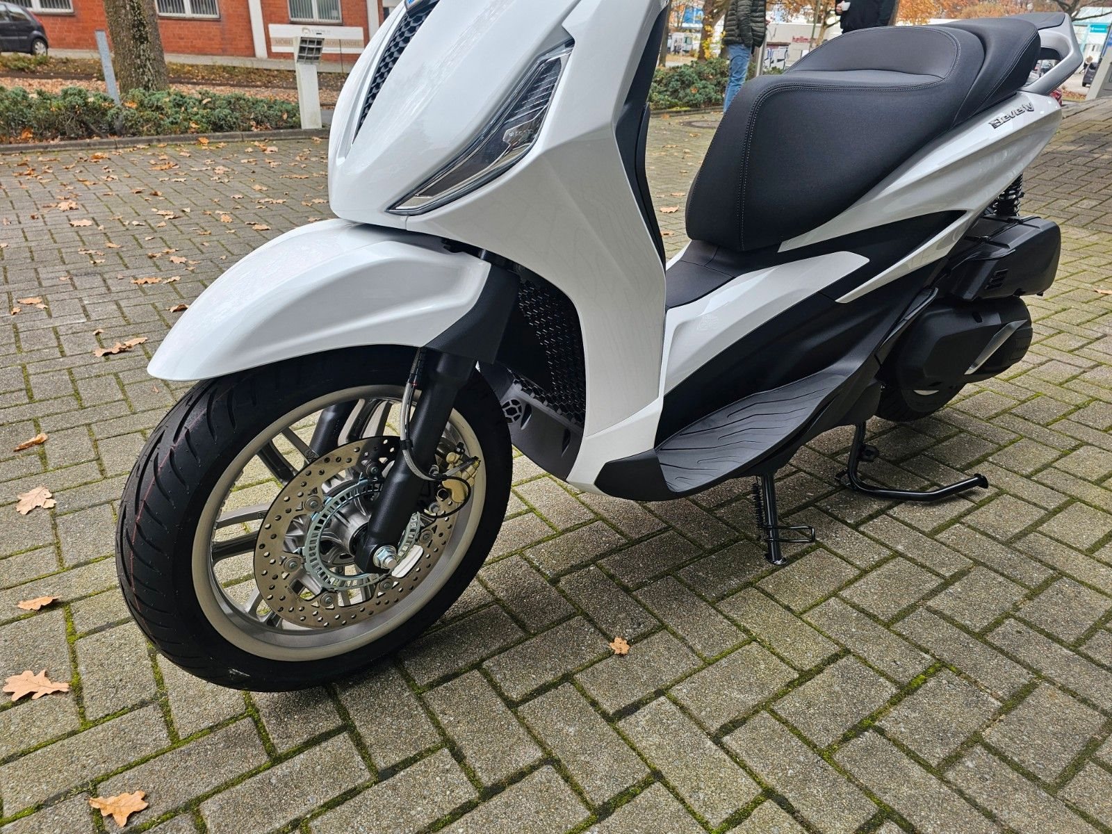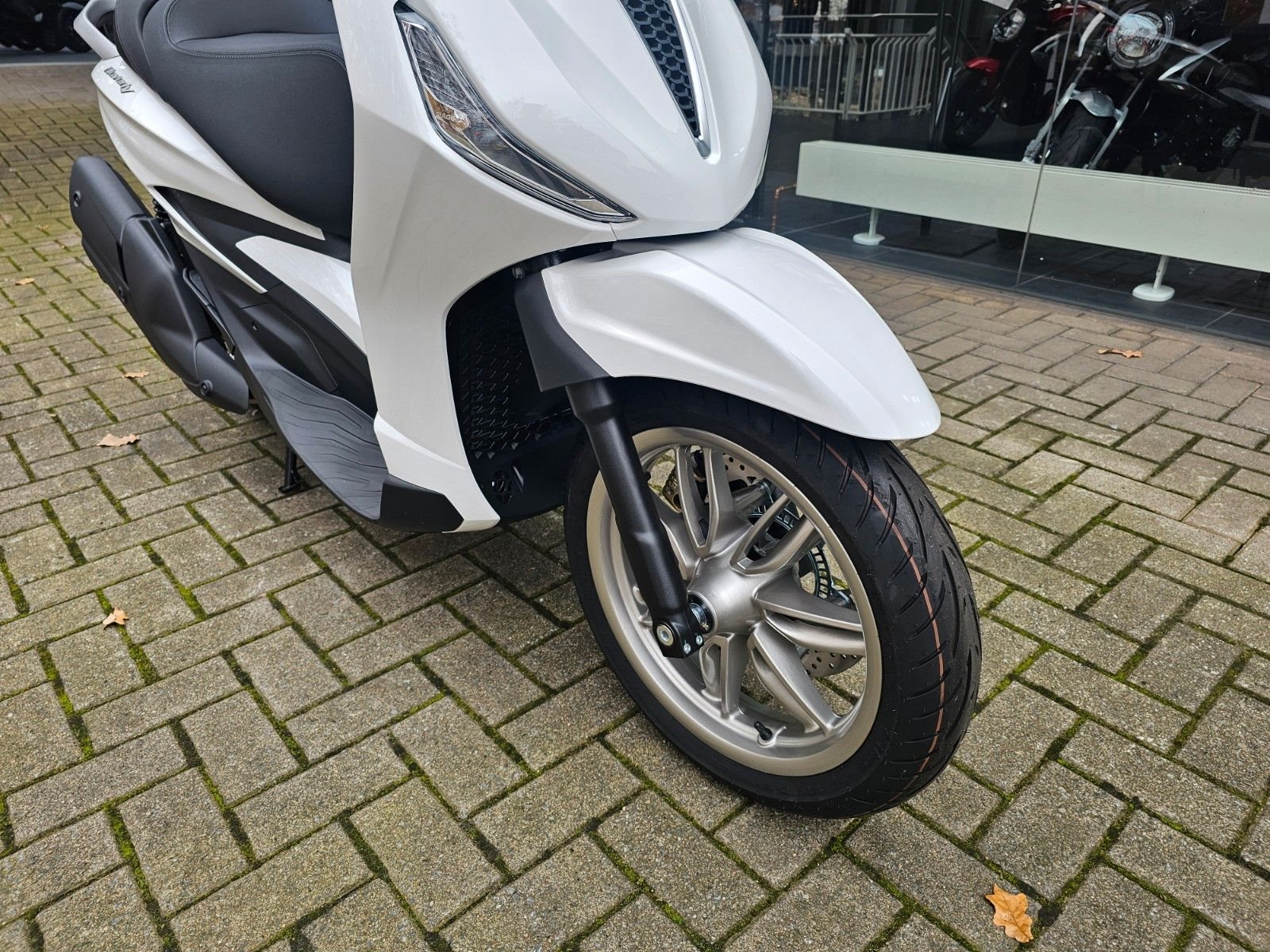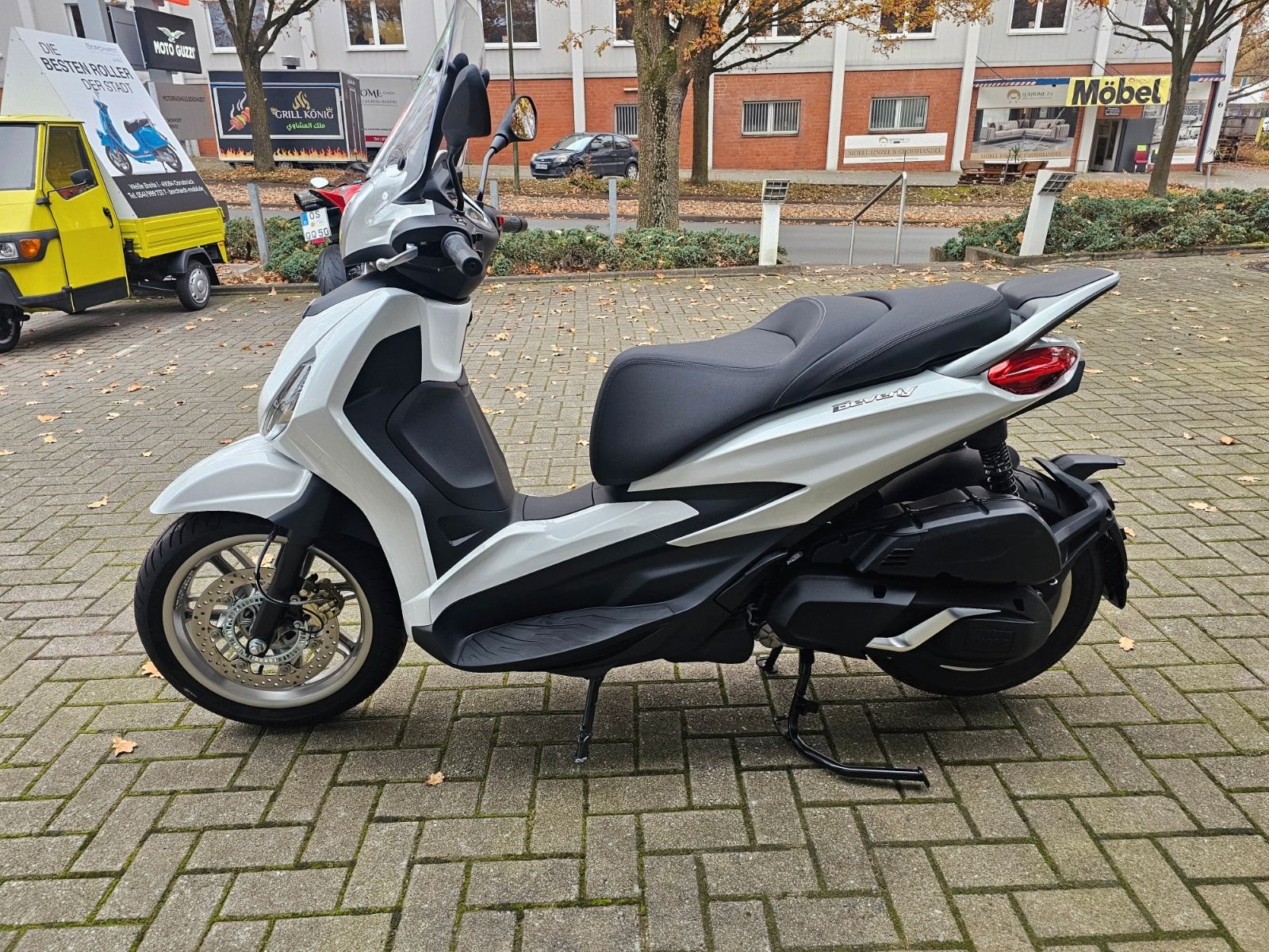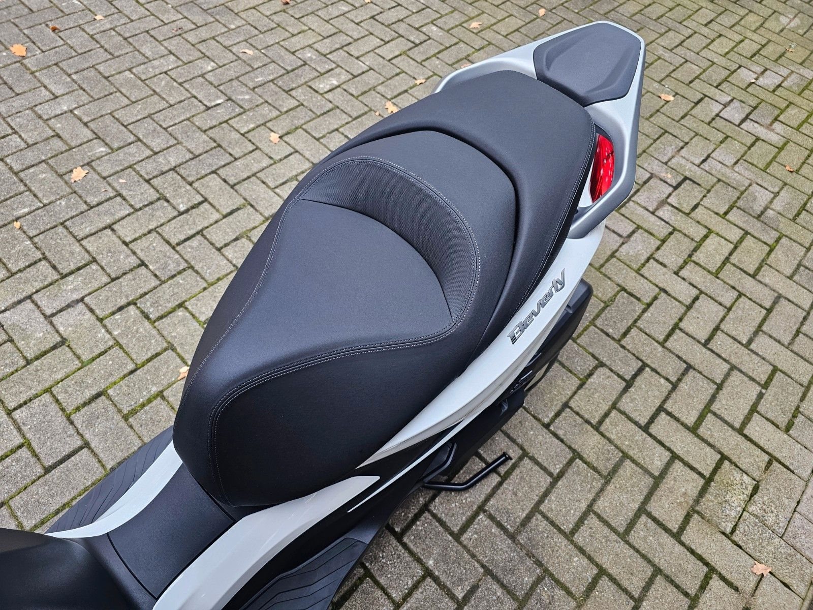 - LED-Scheinwerfer Der Piaggio Beverly ist mit LED-Lichtanlage ausgestattet, die Sichtbarkeit und Sicherheit verbessert. Der LED-Frontscheinwerfer erzeugt eine unverwechselbare Lichtsignatur, während die Blinker, Tagfahrlichter und das Rücklicht ebenfalls mit moderner LED-Technologie arbeiten und so das markante Design des Fahrzeugs abrunden.