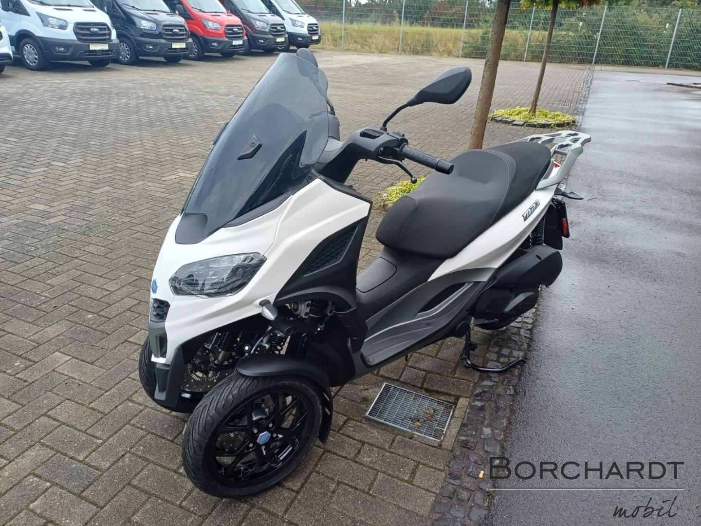 Der Piaggio MP 310, der mit einem PKW-Führerschein Klasse B gefahren werden kann, überzeugt durch seinen kühnen, dynamischen Stil, der von den neuesten Trends im Automobildesign inspiriert ist. Metallisch graue, satinierte Details betonen die fließenden Linien, während die Sitzbank mit grauen Texturen und kontrastierenden grauen Nähten versehen ist. Das getönte Windschild ist mit seitlichen Deflektoren für zusätzlichen Schutz und Komfort ausgestattet, und das schlanke Heckteil rundet das moderne, elegante Design ab.