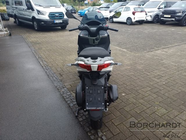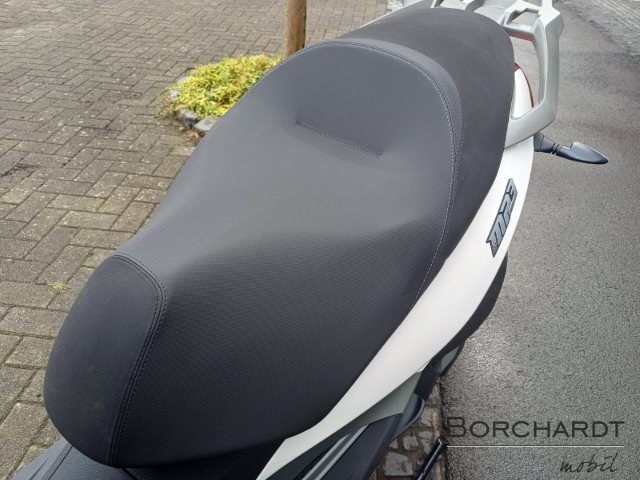 Der Piaggio MP 310, der mit einem PKW-Führerschein Klasse B gefahren werden kann, überzeugt durch seinen kühnen, dynamischen Stil, der von den neuesten Trends im Automobildesign inspiriert ist. Metallisch graue, satinierte Details betonen die fließenden Linien, während die Sitzbank mit grauen Texturen und kontrastierenden grauen Nähten versehen ist. Das getönte Windschild ist mit seitlichen Deflektoren für zusätzlichen Schutz und Komfort ausgestattet, und das schlanke Heckteil rundet das moderne, elegante Design ab.