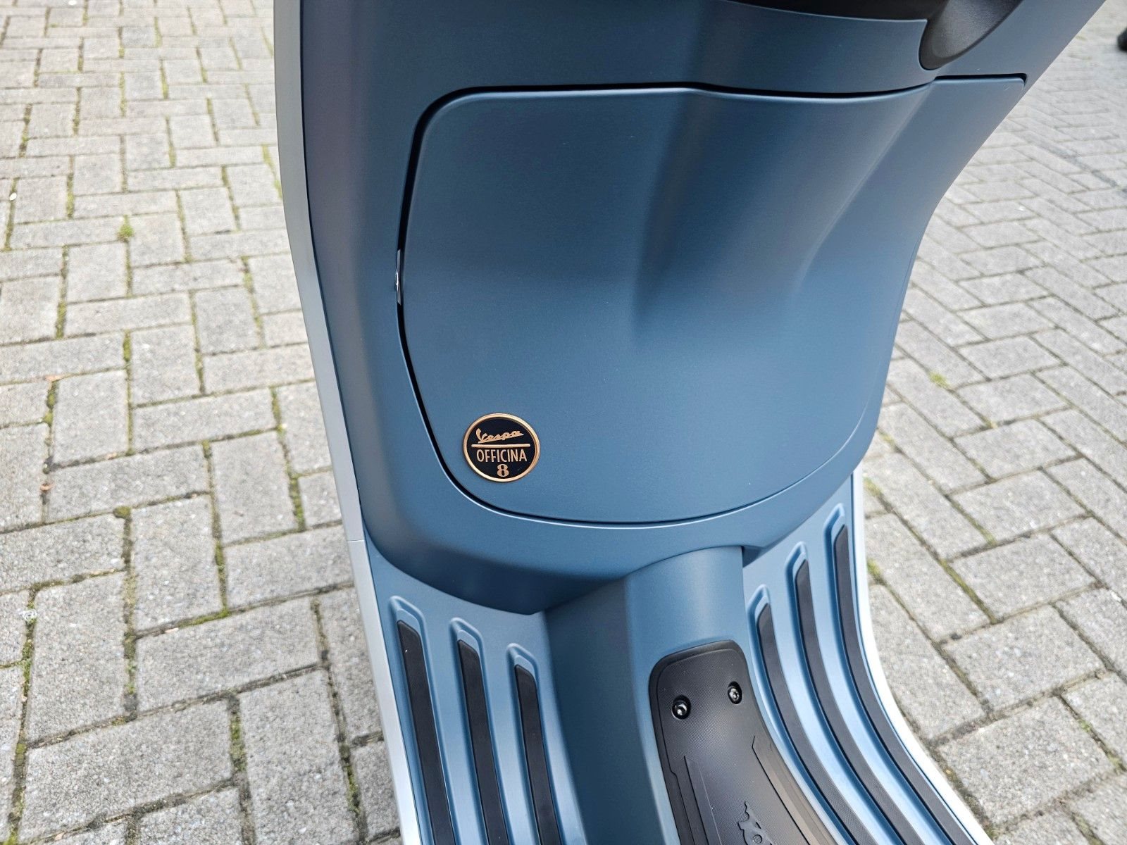 - Design Zu den Elementen, die die Vespa Primavera Officina 8 einzigartig und sofort erkennbar machen, gehören ästhetische und funktionale Merkmale, die von der Werkstattumgebung inspiriert sind. Die matte blaue Lackierung, die an Industriemaschinen erinnert, vermittelt Kraft und Charakter. Metallene Details sorgen für Glanz und betonen die ikonischen Linien des Fahrzeugs, während Messingfelgen das Design abrunden und die Ästhetik im Industrial-Stil unterstreichen.