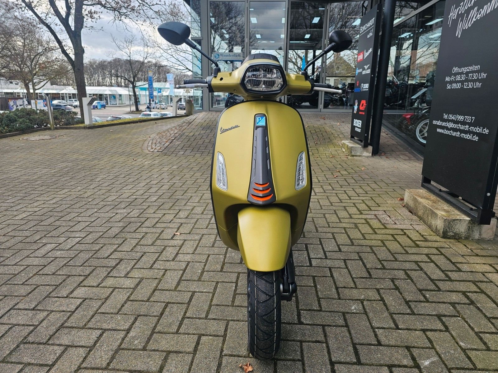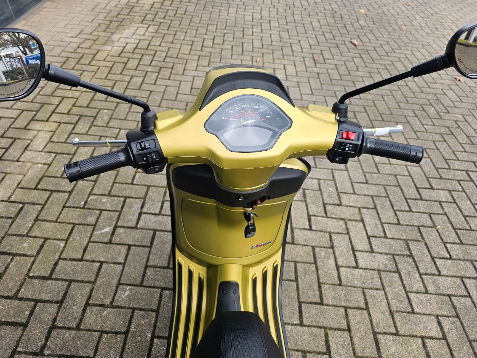 • Cockpit : Das sportliche und funktionale Hybrid-Analog-LCD-Cockpit ist durch einen mattschwarzen Spoiler geschützt und sorgt für eine intuitiv und leicht ablesbare Anzeige der wichtigsten Informationen. Angezeigt werden unter anderem die Höchst- und Durchschnittsgeschwindigkeit sowie der aktuelle und durchschnittliche Kraftstoffverbrauch. Zur weiteren Standardausstattung gehört der Bike Finder, der die Blinker aktiviert, so dass Sie Ihre Vespa auch auf einem überfüllten Parkplatz leicht finden.
